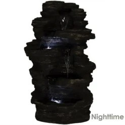 Add an extra natural element to the garden, the yard, or the patio with this large, rocky, outdoor waterfall fountain. Features like this one make it easy to capture the beauty and soothing aspects of a natural waterfall with its eye-catching waterfall features and relaxing ambiance. With expert detailing and a realistic appearance, this rock waterfall fountain will be a focal point in any landscaped area for many seasons to come. The polystone material it is made from is more durable and heavier than resin or fiberglass but still much lighter than concrete or stone fountains, so it is easy to maneuver around the yard while remaining durable to the elements. The LED lights illuminate this fountain at night.