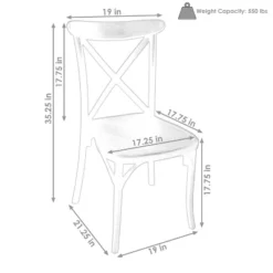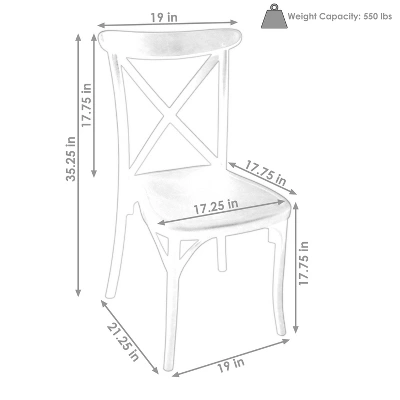- • COMFORTABLE SIZE: 19 inches wide x 21.25 inches deep x 35.25 inches tall; 8.4 lbs per chair; Weight capacity: 550 lbs; Seat: 17.25 inches wide x 17.75 inches deep x 17.75 inches tall; Back: 19 inches wide x 17.75 inches tall