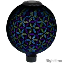 Bring illumination and an attractive, mosaic-inspired focal point to any garden or patio with this cool blooms, glass garden gazing globe featuring LED lights powered by a solar panel that rests on top. Featuring an attractive mosaic design, this decorative accent is sure to enhance a variety of outdoor spaces with cool shades of blue, green, purple, and white. It features a stemmed bottom with a rubber cap that protects the edges of the stem from vibrations from other objects or outdoor impacts. This design also makes it easier to place this gazing globe in a decorative stand (please note, a stand is not included with this piece of decor and must be purchased separately). Always store the gazing globe indoors before freezing or harsh weather occurs to better ensure its longevity. The solar panel on top of the globe must be placed in direct sunlight for 6-8 hours to fully charge the rechargeable battery to power the light.