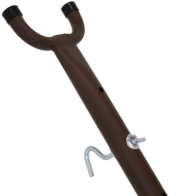 This durable, convenient, and portable hammock stand is designed to hold Brazilian-style hammocks that are 10-12.5 feet long. This stand is made with powder-coated steel and includes hammock hooks to make set up a breeze. The powder-coated steel is strong and durable against the outdoor elements for long-lasting use year after year. And, there are no tools required to assemble this hammock stand. All the hardware is hand-tightened so it can easily be assembled and disassembled in minutes. Plus, there are black plastic caps included to put on all ends to avoid injury, gain style, and uplift the whole feature. The U-shaped design of the stand helps hold the hammock in place. Assemble and disassemble in minutes and use the included carrying case to carry this hammock stand anywhere you want: parks, open fields, your backyard, front yard – anywhere where trees aren’t an option! Easily relax on a cozy hammock anywhere with this stand.