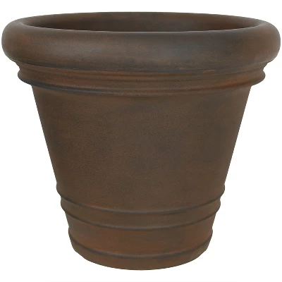 The handsome Crozier planter pot will add instant elegance to any indoor or outdoor living space with bundles of greenery when showcasing your favorite plants and flowers. The contemporary pot features a sleek, rolled rim and is designed for all weather conditions due to its linear, low-density, polyethylene (polyresin) construction and UV-resistant hand-painted rust-colored finish. This feature remains lightweight so you can easily place this planter anywhere you’d like. The double wall design with full-depth inner wall allows for optimal root insulation without compromising the soil capacity. Also, if living in a windy environment, place gravel or sand in the space between the 2 walls to help stabilize it in stronger winds. The planter can be used indoors as well. Please make sure to use a protective saucer when placing indoors to ensure surfaces or floors do not get damaged. Add natural greenery or fun, bright florals to any patio, deck, sunroom, porch, or garden with this classic, sleek, and detailed planter, and watch your plants thrive!