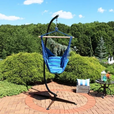Sink into ultimate relaxation with this beautiful and vibrant swinging hammock chair. The colorful cushions provides comfort and style. This hammock chair is sure to bring a colorful spark to your space while accommodating a weight capacity of 260 lbs. Enjoy relaxing times alone with nothing but a few snacks, a great book, and the great outdoors. The included C-stand is constructed of durable, powder-coated steel. For the fabric, make sure to bring it inside or cover up your hammock chair in rainy weather to better ensure longevity. With various color options available, this hammock is sure to complement any decor. The hardware needed for hanging the chair is not included.