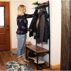 Organize the entryway with this sophisticated hall tree bench featuring a coat and shoe rack. This convenient entryway bench with hooks is great for containing clutter and storing coats, shoes, backpacks, purses, and more! Featuring a shelf and bench seat made from scratch- and stain-resistant, medium-density particleboard (MDP) and a powder-coated steel frame, this modern entryway coat rack bench has a distinct, industrial-style look that will complement any decor style. Plus, it has four protective PVC feet to help prevent floor scratches and scrapes. This hall tree features three hooks for hanging coats, scarves, or purses and bags as well as a lower shoe rack that can store up to four pairs. The bench and upper shelf also provide convenient surfaces where you can keep lunchboxes, hats, and gloves. It can even be used to display houseplants or picture frames. It’s a convenient addition to the entryway, utility room, or mudroom.