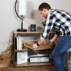Add style and storage to the living room, office, or hallway with this sophisticated console table. This sturdy accent table for entryway features an industrial-inspired design that will complement a wide variety of decor styles and furniture types. Its narrow design makes it easy to fit behind a sofa or against a wall in a hallway. It features 3 fixed shelves made of scratch- and stain-resistant, medium-density particleboard to resist daily wear and tear. This living room console table includes a removable serving tray that is also made of MDP and features steel handles. This tray can be used to serve drinks and snacks or store clutter items like remotes, magazines, and drink coasters. When not in use, the tray fits neatly into the second shelf. To ensure that the couch table with shelves remains securely upright, a convenient wall strap and anchoring hardware are included. A drill is required for installation (not included).