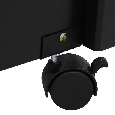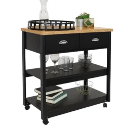 This black kitchen cart with storage is great for a variety of uses around the house. Easily pull out this cart for extra tabletop space when preparing meals, use it as a serving cart for entertaining parties with friends, or even place it in the living room or bathroom for a unique storage option. Constructed of MDF with an oak-colored tabletop finish, this kitchen microwave cart with storage enhances the natural beauty of any room by mimicking the look of real wood while remaining durable for years to come. Featuring 2 drawers to easily tuck away utensils and other miscellaneous items, an aluminum towel rack, two open lower shelves, and a tabletop to add potted plants, pictures, and other decor, this cart completes any indoor space. The drawers feature silver zinc alloy knobs and carbon steel drawer slides for ease of use. All assembly hardware is included to enjoy this rolling cart almost right out of the box (please note, a Phillips screwdriver, rubber mallet, and hammer are required for assembly but are not included).