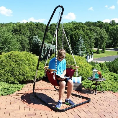 • COMFORTABLE HAMMOCK CHAIR: Chair and pillow are constructed of durable and easy-to-maintain polyester fabric with a polyurethane foam fill; The beautiful bamboo wooden armrest provides a sturdy place to set your arms; Stand is made of strong 1.5-inch diameter tubular steel with a black powder-coated finish; Stand height adjusts between 79 to 93 inches with 5 height options easily set by moving the position of four 3-wing knob screws