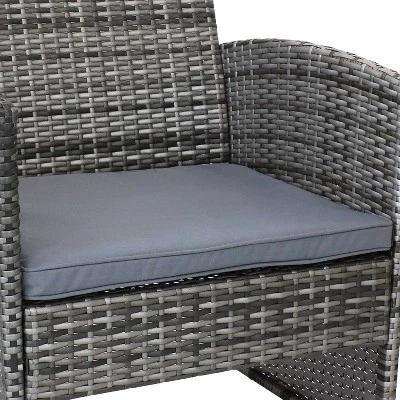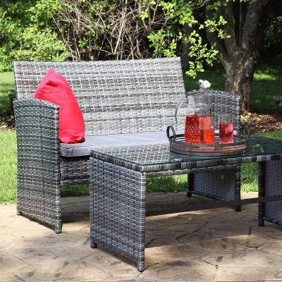Invite family and friends to unwind in the backyard or on the patio with the Ardfield, 4-piece, patio conversation set. Featuring plush polyester cushion covers with cushy polyurethane foam fill, this furniture adds style and comfort to any outdoor living space. This stylish furniture set has the look of traditional wicker but is made with a steel frame wrapped in polyrattan materials. Polyrattan mimics wicker but is smooth to the touch, won’t chip, and is durable against the elements outdoors. The cushions feature strong and durable polyester covers with plush polyurethane foam padding inside. Polyester is a strong yet soft material that is sure to last year after year, even when used outdoors. These pillows are also easy to clean and maintain. The 3 included accent pillows effortlessly add more comfort and style to the seats. This furniture set would look stunning in the garden, on the front porch, or anywhere else cozy seating is needed.