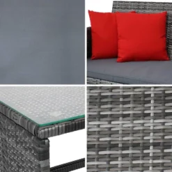 • STURDY AND COMFORTABLE: Coffee table: 35.5″ W x 18″ D x 17″ H; Glass tabletop: 35.25″ W x 18″ D x 0.25″ thick; Weighs 18.2 lbs; 55 lb weight capacity; Accent pillow: 14″ square x 4″ thick; Furniture has a powder-coated steel frame wrapped in polyrattan; Coffee table features a clear glass top that is perfect for setting down your favorite beverages; Perfect to enjoy and lounge poolside