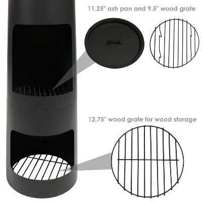 Add a modern touch to any outdoor living space with this steel construction, wood burning chimenea fire pit with built-in storage area in the bottom back of the heater. Durably made of steel, this fire pit is perfect for backyard gatherings on cool evenings, for friendly get togethers, and for long summer nights. It features a handy firewood storage area underneath the fire pit, so fuel can easily be on hand when needed. This fire pit also includes a poker to stir the logs and coals to keep the fire going without having to worry about burns. This chimenea fire pit also features a log grate for both the fire area and the log storage area. Another great item included is the ash pan, which makes cleaning up the fire pit much easier and more convenient. With its unique design and sleek, contemporary aesthetic, this fire pit is sure to bring fun and functional heat to your space with ease.