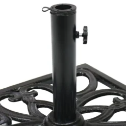 Add an elegant and functional piece of outdoor decor to any patio or backyard with this cast iron, heavy-duty, black, geometric designed umbrella base stand. Durably constructed of cast iron, this outdoor patio umbrella base is weather resistant and can withstand the elements outside to last season after season. This umbrella base is also incredibly versatile and can accommodate umbrella poles of different sizes. The stand alone can accommodate umbrella poles up to 2″ in diameter. The included pole adapter is designed for smaller patio umbrella poles and can accommodate poles between 1.5″ and 1.75″ in diameter. The patio umbrella stays firmly in place with the included thumbscrew. Keep your friends and family safe from the sun with a beautiful umbrella feature on your patio, deck, in the yard, or at the campsite, and keep it in place no matter the wind or other weather conditions with this durable, heavy-duty base.