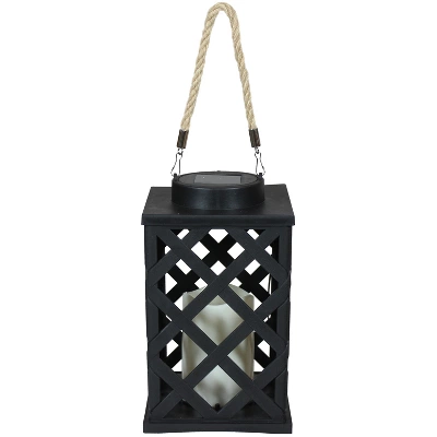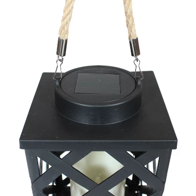 Add cozy charm to your backyard patio or porch with the modern crosshatch solar lantern featuring LED lights. Constructed durably of plastic, this outdoor lantern beautifully replicates the look of a classic metal lantern with a sleek black finish while easily able to withstand the elements when placed outdoors. It also features a rope handle to add a bit of nautical flair to your outdoor décor as well as thick, lattice detailing in the front to add more elegance to any outdoor space. Pair it with a rustic wooden crate, or place on your front steps to add a touch of charm to the exterior of your home. This lantern uses solar power to charge a AA rechargeable battery. Simply place the lantern in a location where it will receive 6 to 8 hours of full, direct sunlight each day. At night, the light will turn on automatically with the built-in light-detecting sensor.