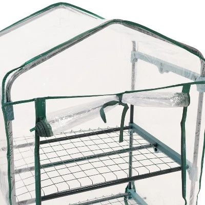 Have a successful growing season with help from this small greenhouse for plants. With two shelves for growing plants and storing supplies, this portable mini greenhouse is perfect for creating the ideal climate for growing all your favorite vegetables, herbs, fruits, and flowers. This greenhouse is durably constructed from an iron tube frame with steel wire shelves and a polyethylene covering coated with a UV ray protective finish. The durable cover protects plants from inclement weather, like frost and excessive heat or too much moisture. The cover of this mini greenhouse is transparent so light can filter through to ensure plants receive the perfect amount of sunlight needed to grow. A roll-up door makes accessing your plants easy and allows you to control airflow in and out of the greenhouse. Simply tie the door up to keep it open or untie and zip the sides down to keep it closed.