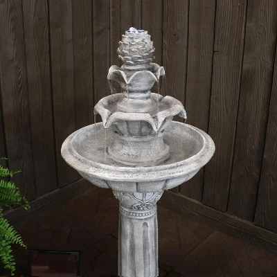 Add classic style and eco-friendly solar power to any garden or landscape with the ornate elegance, tiered, outdoor, solar powered water fountain featuring a backup battery. This fountain is constructed of lightweight and durable polyresin so you can easily move this water feature anywhere you want while it remains resistant to the elements outdoors. Polyresin is easy to clean and maintain yet replicates the look of traditional stone at the same time. When the solar panel is in direct sunlight, the pump will be powered by solar energy and the battery pack will recharge. Once fully charged, the battery will power the fountain for up to 4 hours. The battery will also automatically run the fountain when it is cloudy or nighttime. Place this stunning, detailed fountain in any yard, patio, deck, front porch, garden, other landscaping, or other outdoor space, and watch your backyard illuminate with soothing sounds and beautiful views.