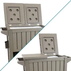 • MANY ADDITIONAL FEATURES: The outdoor patio cooler bar cart features a resin construction with woodgrain design, a roomy 31″ W x 18.25″ D prep top, and a built-in bottle opener. The lockable wheels and metal push bar make it easy to move this cart from place to place. It also features a variety of convenient, built-in storage for spices, utensils, and condiments.